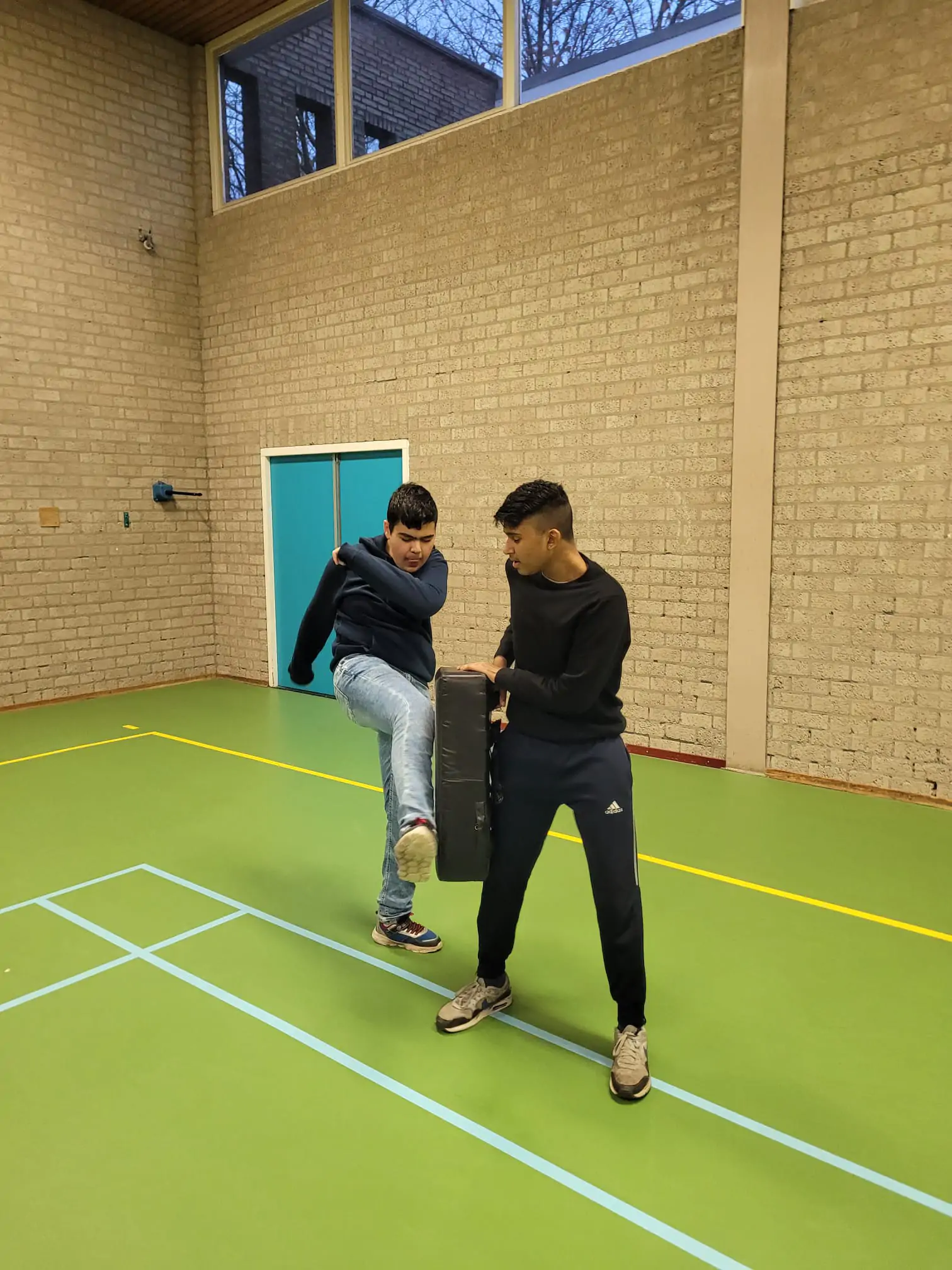Het was een pittig uur waarbij we allemaal hard aan de bak moesten. Van stoten maken op elkaars handen tot trappen tegen een stootkussen, alles kwam voorbij!